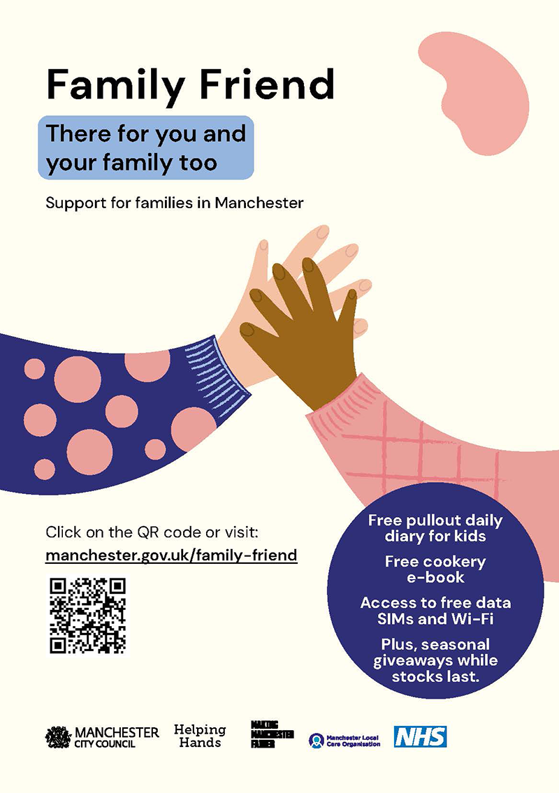 Raising a family can be joyful but also challenging. The ‘Family Friend’ offer brings together support available across Manchester – from health and childcare, to food, activities and emotional wellbeing.
