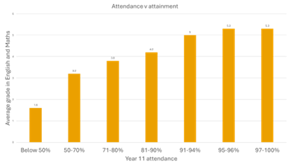 Good attendance is central to academic achievement, the graph below shows data from last year’s Year 11 cohort. This clearly illustrates the link between attendance and GCSE grades: